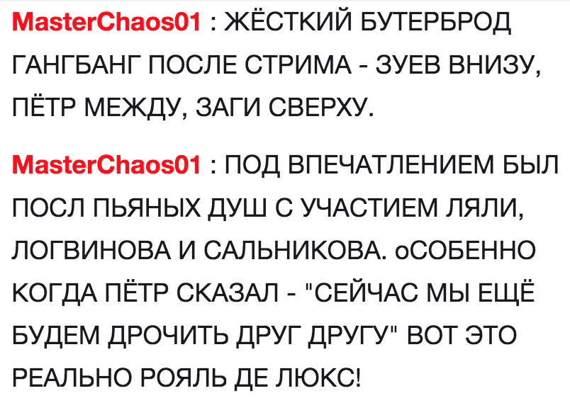 Представляю картину успешный менеджер среднего звена приходит домой, целует жену. Рассказывает как у него прошёл день. Ужинает со своей семьёй. Укладывает детей спать. Включает классическую музыку на дорогой аудиосистеме, наливает бокал хорошего вина. Садится за макбук и начинает писать «ВЫ ВСЕ ПЕТУХИ! ЧЕРНОЖОПЫЕ ПИ%№РЫ! МРАЗИ! СОСИТЕ Х№Й! ЗУЕВ ПИД%№С!!! ХУЕ№%СЫ!!! САЛЬНИКОВ М%№К!!!!».