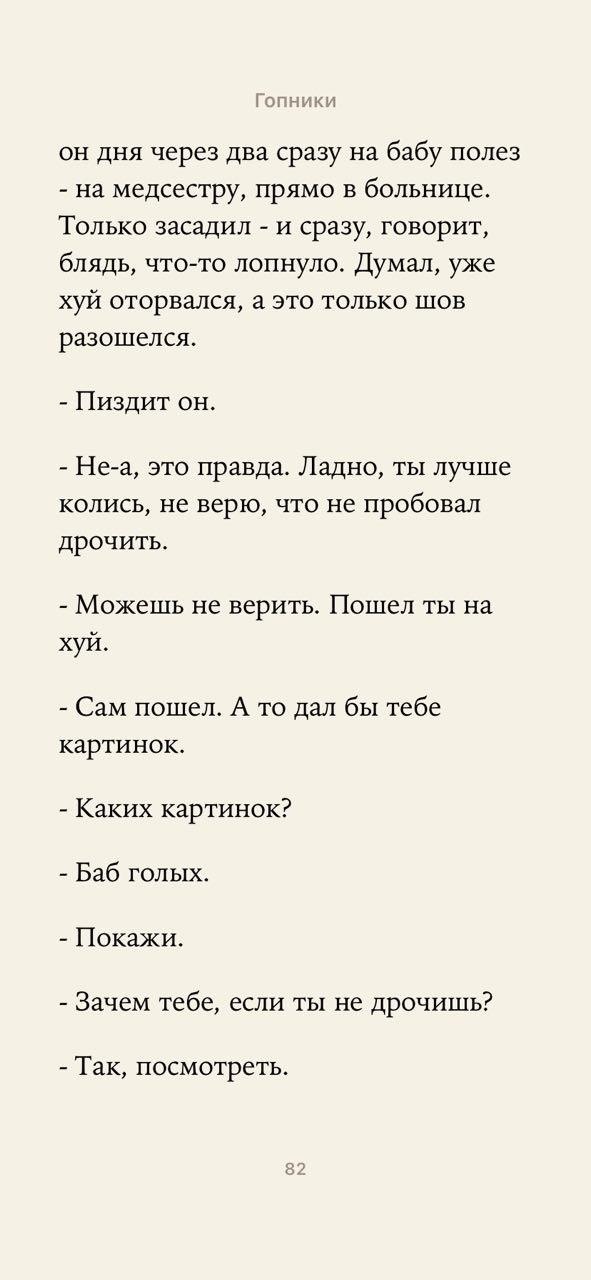 Ну хз. Не читал но из статьи сложилось впечатление что автор не был участником всех этих событий, а лишь фантазирует на основе увиденного и стереотипов. Обычные жлобы с периферии никакого отношения к мурчащим гопникам не имеющие. Может и почитал бы но из приведённых отрезков меня неслабо кринджанудо.