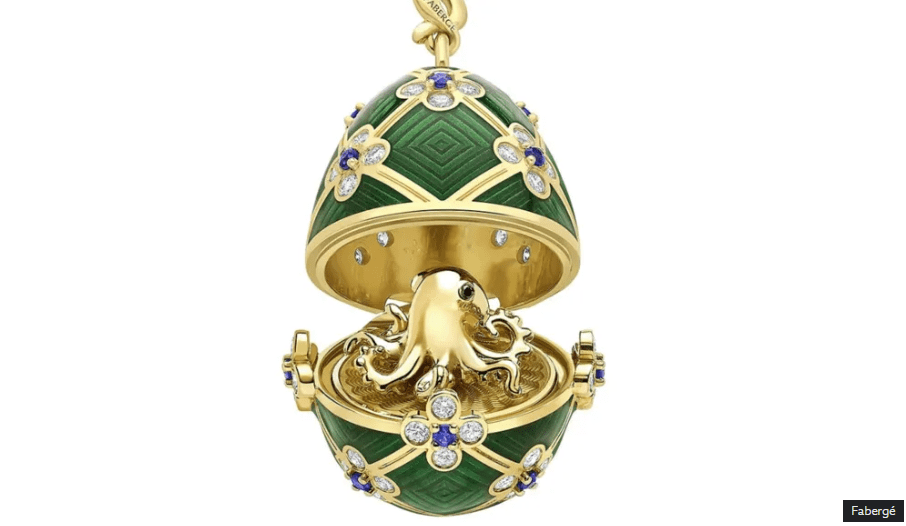 Согласно информации на сайте ювелирного дома, украденное яйцо Фаберже инкрустировано 60 белыми бриллиантами и 15 голубыми сапфирами. Внутри находится миниатюрный осьминог из 18-каратного золота.
