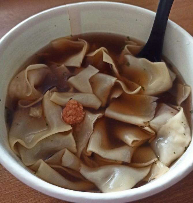 Да, это батин суп с лапшой и пельменями. Как ни странно, но хрючево вполне норм. Я бы даже сказал сытное. Лапша не выдающаяся, но пойдет. Пельмешки съедобные, хотя от заявленных креветок там одно название. Самое хорошее, что в этом блюде есть — это бульон. Не сильно соленый, не острый — самое то похлебать осенним вечером после прогулки по холоду.