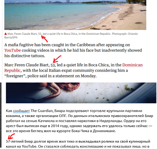Марк Ферен Клод Биар, 7 лет скрывавшийся в Доминиканской республике член итальянской преступной группировки Ндрангета, был найден через YouTube. Биар выкладывал у себя кулинарные ролики, при этом никогда не показывал на видео лицо — тем не менее, его удалось вычислить по татуировкам на руках и теле.