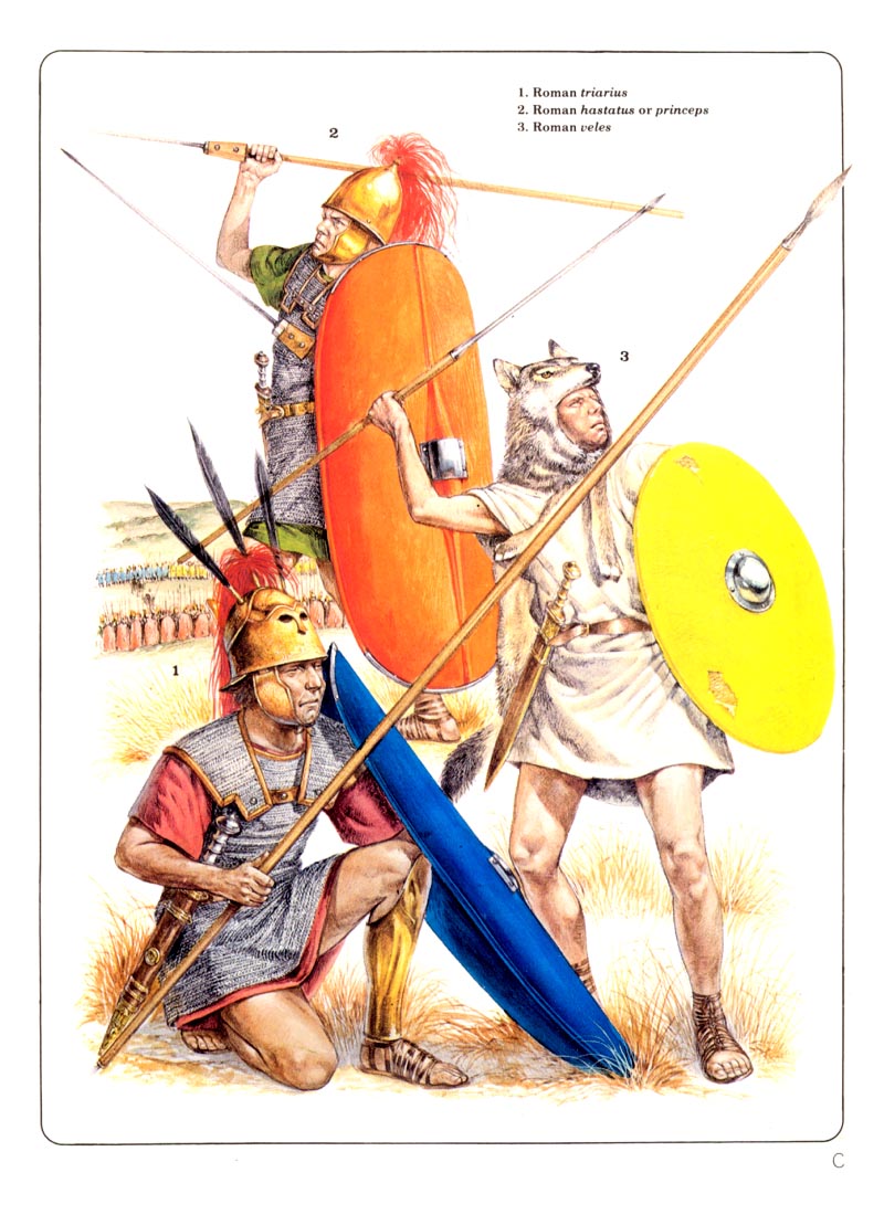 Более богатыми, а значит и более серьезно вооруженными воинами были принципы. Они надевали шлемы с перьями, корпус защищали позаимствованной у кельтов кольчугой, позже превратившейся в лорику хамату, и имели большой прямоугольный щит-скутум. Вооружены были гладиусом и несколькими пилумами.