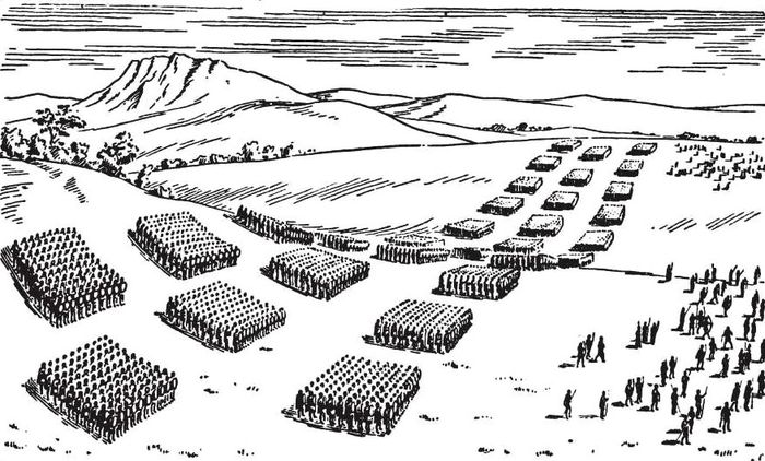 Так вот, сутью всего этого чуда тактики были квадраты. Каждая манипула гастатов становилась квадратом на расстоянии друг от друга. Вторая линия принципов — также, только их квадраты вставали сзади линии гастатов между их квадратами. Позади стояли триарии. Получалась такая шахматная доска из воинов. Легковооруженная мелочь строя не имела и бегала перед общим войском или по флангам.