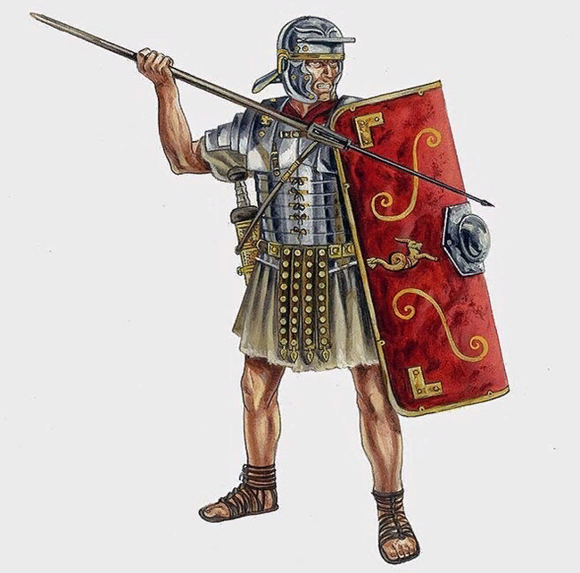 Голову нашего красавца прикрывал шлем имперского типа из бронзы, а затем и из железа. Кроме купола, закрывавшего голову, на нем были подвижные нащечники, металлический козырек и длинный назатыльник, закрывавший шею и часть спины сзади. Вместе с тяжелым щитом-скутумом, окончательно принявшим общеизвестные формы (выпуклый прямоугольник), все это позволяло бойцу чувствовать себя максимально защищенным на поле боя.