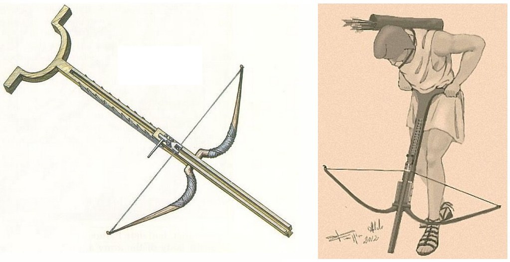 Эллины не зря считаются народом исследователей и изобретателей, в плане военных метательных машин они также были первыми. Началось все с гастрафета (арбалета, заряжающегося с упором в живот). Некоторые, особо крупные были с крюками, которыми цеплялись за стены, отстреливая врагов при осадах.