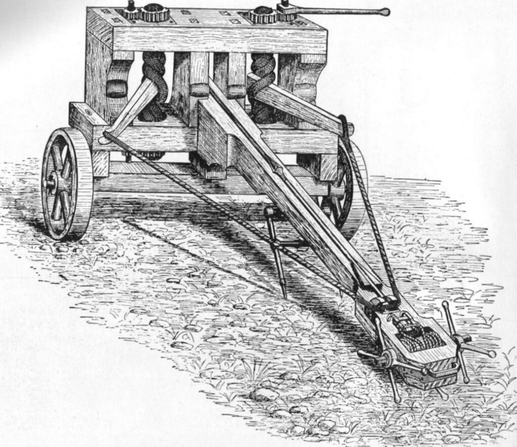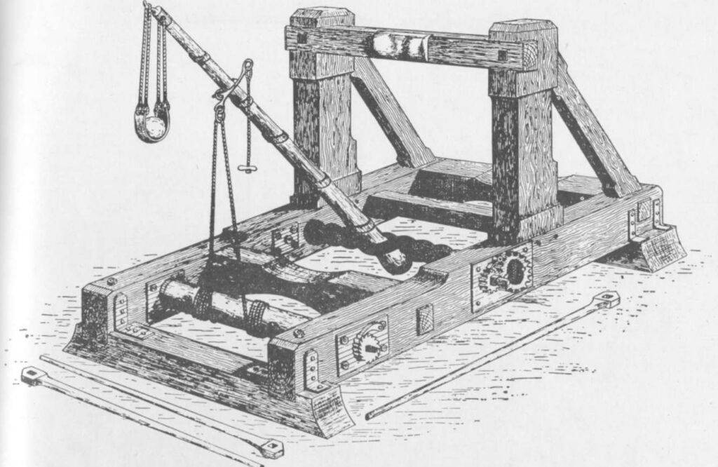 Дальше больше. Кто-то догадался поставить гастрафет на станок и вуаля — появился оксибел, гигантский арбалет, метавший в противника стрелы. С V века до нашей эры греки наконец-то пришли к важнейшей идее — они начали вить веревки. И закручивать их, создавая торсионные машины. Делалось это так — брались жилы животных или женские волосы, из них создавались канаты, в них вставлялся рычаг, он перекручивался до предела, затем распрямлялся, и что-то летело в противника. Если туда вставляли ложку, в которую пихали камень — получался палинтон или камнемет. Если же таких закрученных канатов было два, они действовали навроде лука и метали стрелы — получался эвтитон или стреломет.