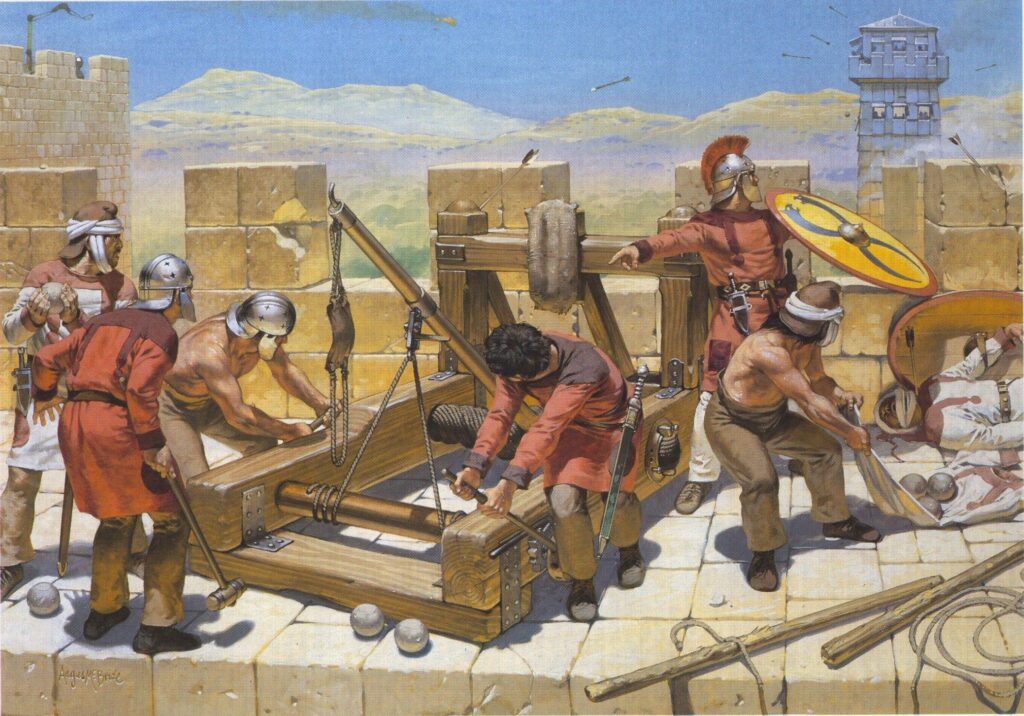 Очень ярко описывает воздействие осадных машин на осажденных древнееврейский историк Иосиф Флавий, живший в I веке нашей эры. По его словам, римский военачальник Веспасиан приказал использовать против осажденного города Иерусалима 160 машин. В восставших евреев полетели камни весов в 26 кг, забрасываемые на 360 метров, огромные стрелы и зажженные головни. Они летели так густо, что на стене было невозможно находиться. Огромные валуны неслись, издавая ужасный свист, а упав в толпу, превращали людей в фарш, сбивали защитные галереи со стен и разрушали углы башен. Описывает Флавий и совсем чудовищные вещи. Например, одному еврейскому воину, решившему все же остаться на стене, камнем снесло голову, а его череп нашли за полкилометра (три стадия) от тела.
