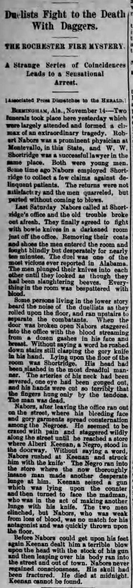 Например, в штате Алабама в 1888 году произошла такая дуэль между доктором Нейборсом и адвокатом Шортриджем. Заперевшись в комнате, они начали шинковать друг друга ножами боуи. Когда через десять минут встревоженные соседи взломали дверь, оттуда выскочил Нейборс с безумными глазами и располосованным лицом. Убежав на улицу, он в каком-то диком безумии бросился на чернокожего хозяина магазина, который его и зарезал. Надо ли говорить, что его первый противник, мистер Шортридж был найден в комнате насмерть исполосованный огромным боуи.