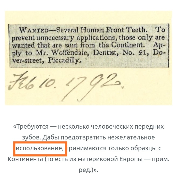 А потом случилось Ватерлоо. Десятки тысяч французов, англичан и прусаков остались лежать в земле. И, что самое важное, в одном месте. Вслед за обычными крестьянами-мародерами на бывшее поле боя ринулись дельцы со всей Европы. Умельцы, которые не боятся замарать руки и репутацию: они выкапывали тела и выдергивали зубы тысячами. Причем старались сделать так, чтобы зубы одного солдата оказались в одном протезе — так эстетичнее.