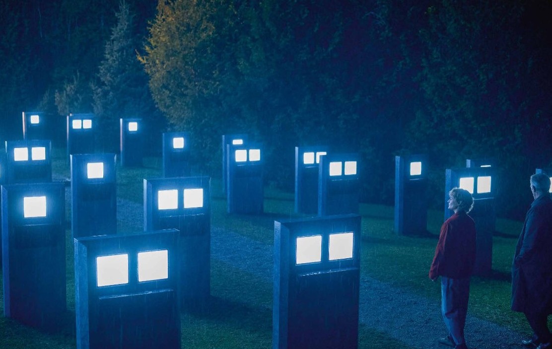 Именно эта проблематика вполне отчетливо раскрывается в фильме. Карш живет мыслями о прошлом, он поглощен горем, и удаленное присутствие в могиле жены — его медитация, облегчающая боль утраты. Он внимательно наблюдает за тем, как разлагается ее труп, и даже свидание с девушкой заканчивает на кладбище («вот смотрите, тут есть увеличение x800, можно разложение костей рассмотреть, правда же красиво?!»). У него крошечный круг общения: ИИ-ассистентка (выглядит будто 3D-моделька эпохи Playstation 2), свояк-айтишник Мори и сестра жены Терри, зарабатывающая на жизнь грумингом собачек.