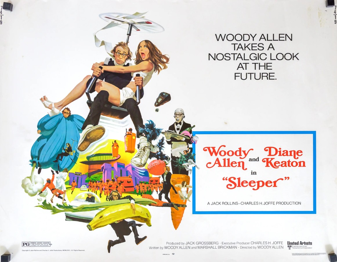 Во-первых, это «Спящий» – комедийная фантастика Вуди Аллена про человека, который ненароком оказался в криокапсуле и, очнувшись через 200 лет, узнал, что его разморозили, чтобы он помог сбросить диктаторский режим. Будущее тут узнаваемое и абсурдное одновременно: Американской Федерацией 2170-х управляет улыбчивый Верховный Лидер (Тимоти Лири, гуру психоделической революции), ежедневно желающий всем спокойной ночи по ТВ, всех кормят искусственными овощами и порошковыми пудингами, а граждан чипируют и вносят в базы данных, чтобы отследить любые возможные нарушения общественного порядка.