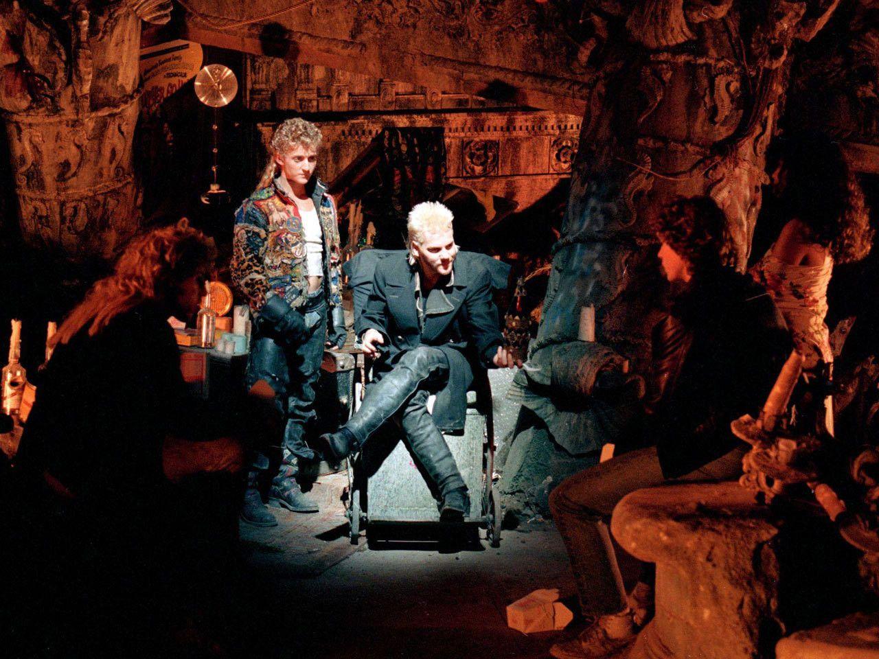 Во-первых, костюмы. Вампирская банда Дэвида выглядит хард-рок командой с обложки ранних альбомов Bon Jovi или Warrant: потертые косухи, нарочито неряшливые прически, обильные значки и аппликации на джинсах и майках – именно так должны выглядеть вечно молодая шпана, уходящая в дикий отрыв каждую ночь. Хотя это лишь малая – пусть и самая яркая – часть гардеробов фильма.