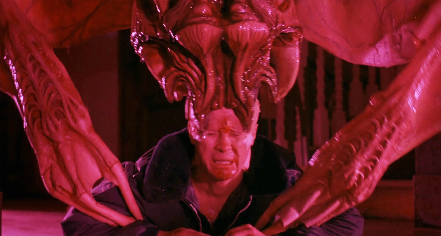 Но сексуальные извращения в «Извне» лишь оттеняют телесные превращения. Фильм полон многообразных физических деформаций, равно как и жутких животных из чуждых измерений. Руки и ноги переплавляются в жирные тентакли, из черепа прорастает сенсорный щуп, в воздухе плавают глистообразные рыбины – пожалуй, ни в одной другой работе Гордона полет захватывающе отвратительных фантазий не был столь высок. Мерзостное великолепие этой склизкой, визжащей и кусающейся плоти сделало «Извне» эмблематичным сай-фай хоррором 1980-х, задав ориентир для кучи подражаний, как тогдашних (взять хотя бы «Проклятие»), так и теперешних (помните слипшихся в мясной клубок несчастных альпак в «Цвете из иных миров»?).