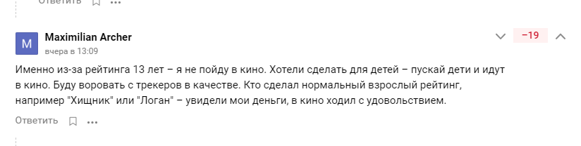Когда я узнал про рейтинг для детей PG13 я сразу решил, что в кино не пойду. Буду воровать с трекеров в качестве BD, без угрызений совести. Моих денег они не увидят. Делали для детей – вот пусть дети вам и платят. На взрослые рейтинги я с удовольствием сходил в кино: на шикарного «Логана» и на весёлого «Хищника».