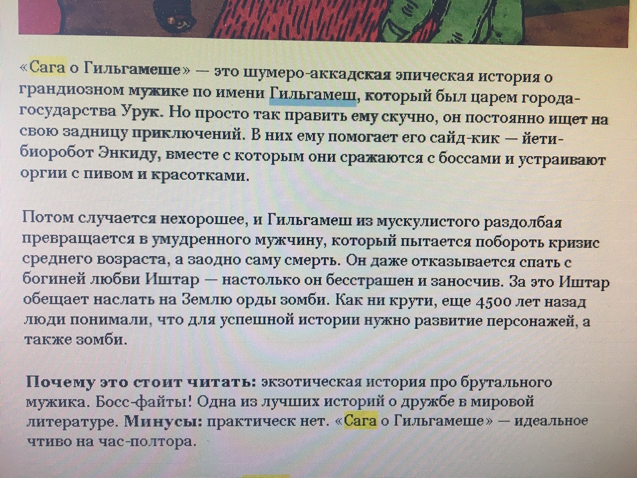 Почему это стоит читать: экзотическая история про брутального мужика. Босс-файты! Одна из лучших историй о дружбе в мировой литературе. Минусы: практическ нет. «О Гильгамеше» — идеальное чтиво на час-полтора.