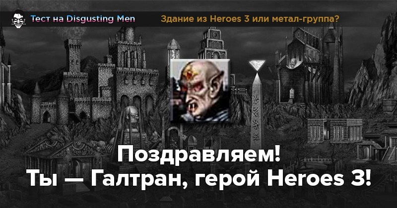 Поздравляем! Ты — Солмир, ведь ты знаешь мир Heroes 3 лучше всех. Ты ответил на все или почти все вопросы правильно и заслужил сравнение с лучшим героем игры.