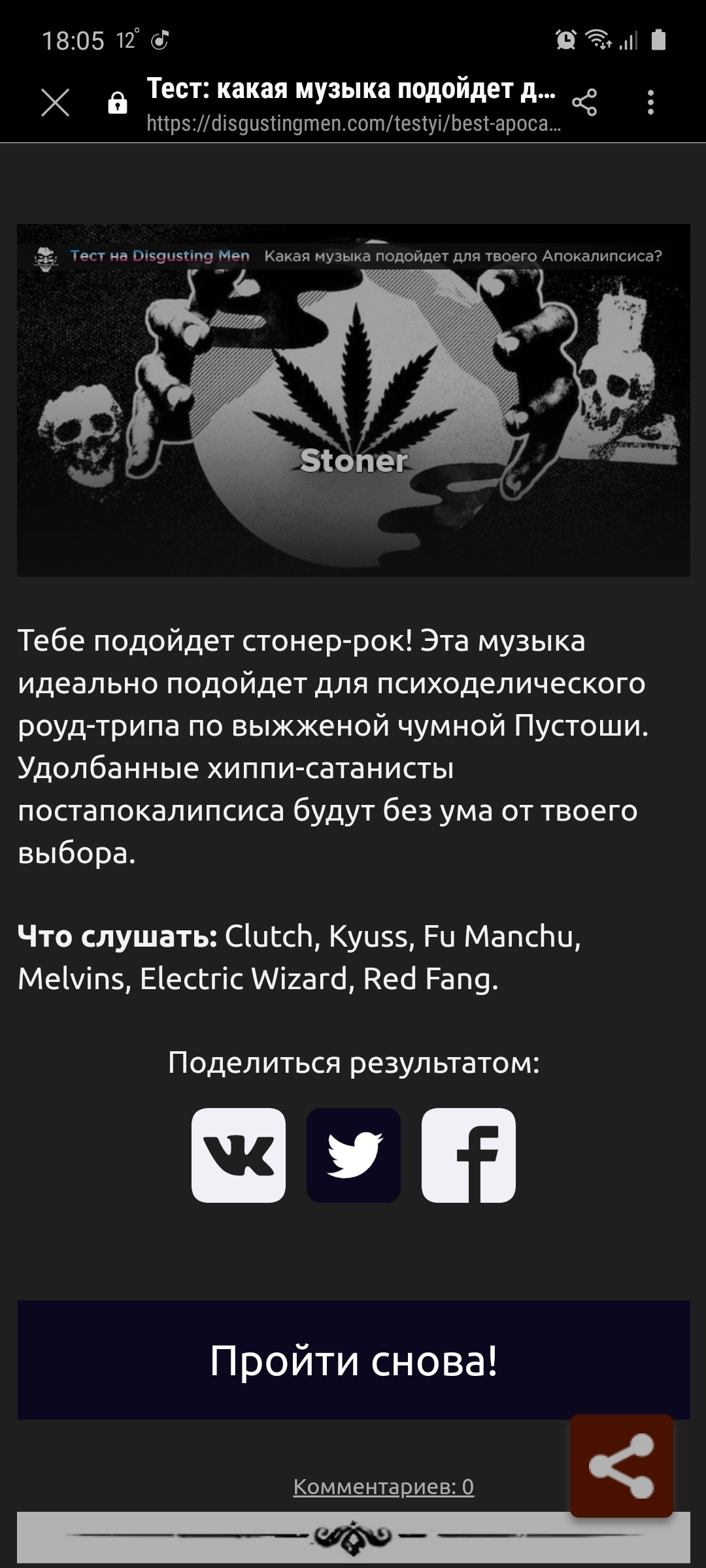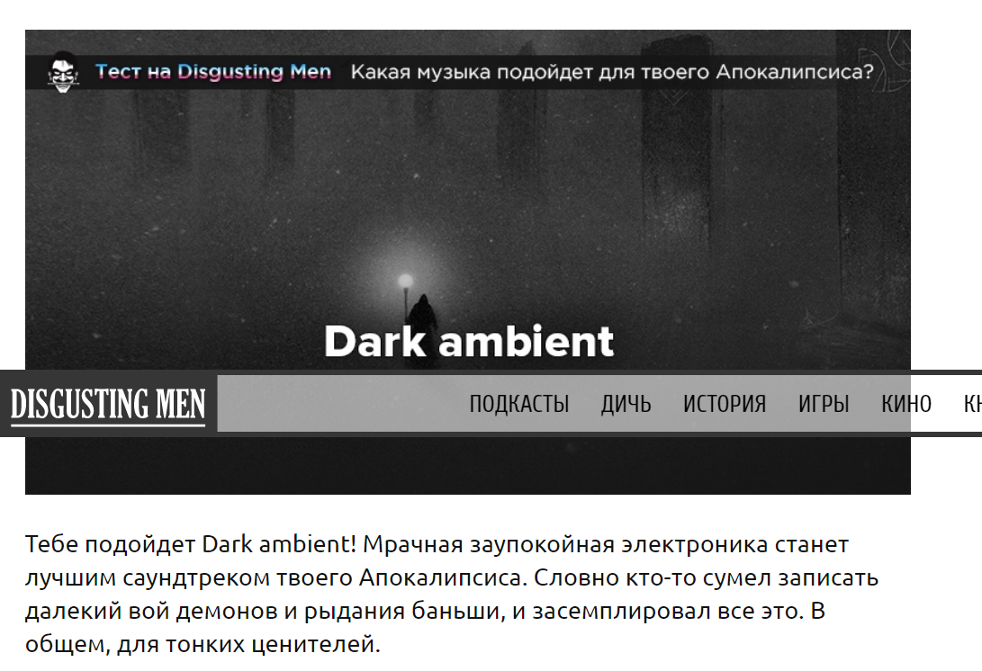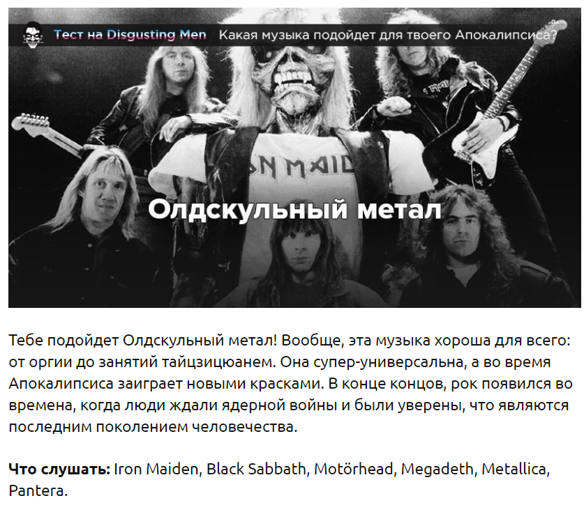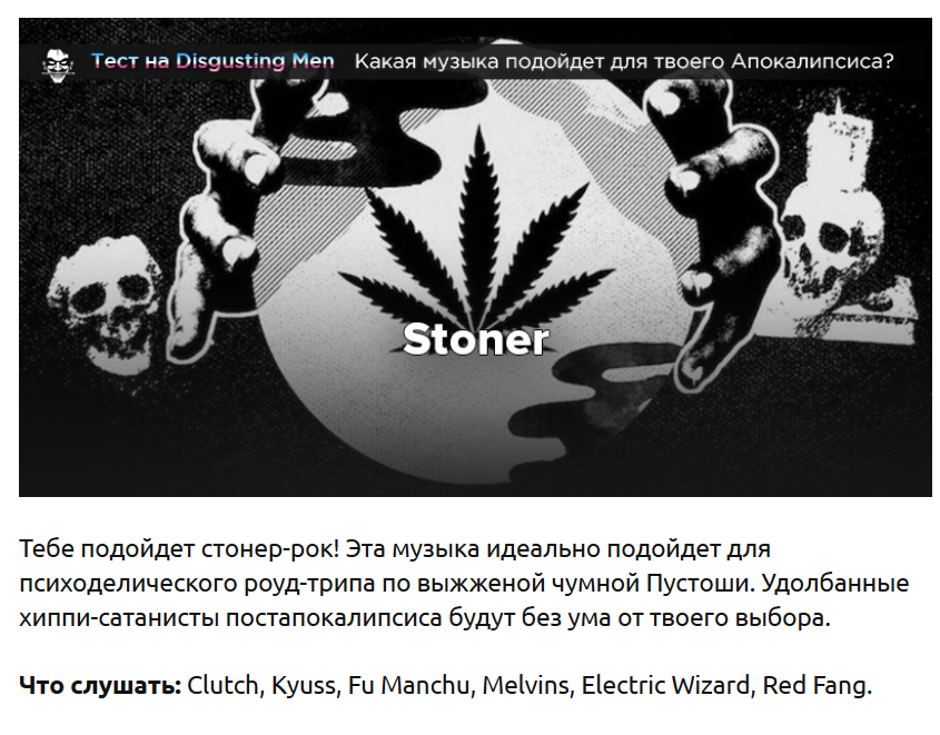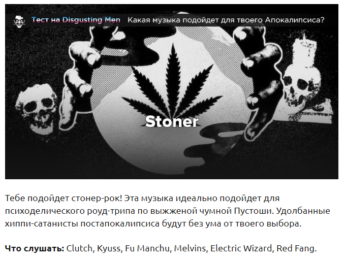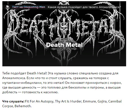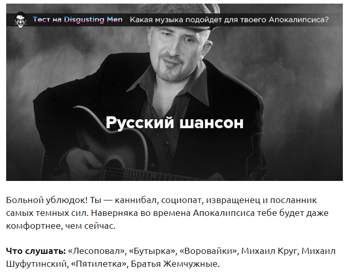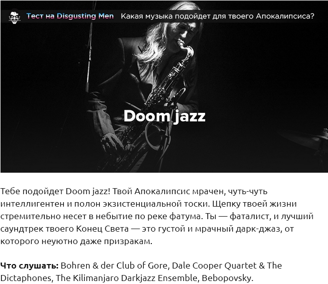 Заготовить на Апокалипсис гречи и патронов может любой дурак. Но заготовить на Конец Света нужную музыку — это удел избранных (то есть, конечно же, тебя). Ответь на несколько вопросов с гипотетическими ситуациями (что-то вроде «КОЗЫ» в Fallout), и мы подскажем, какая музыка подойдет для твоего личного Апокалипсиса.