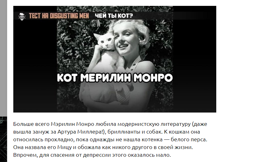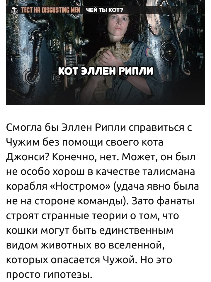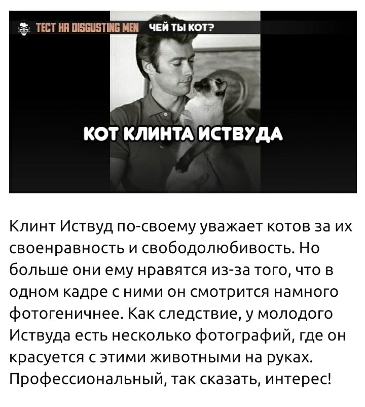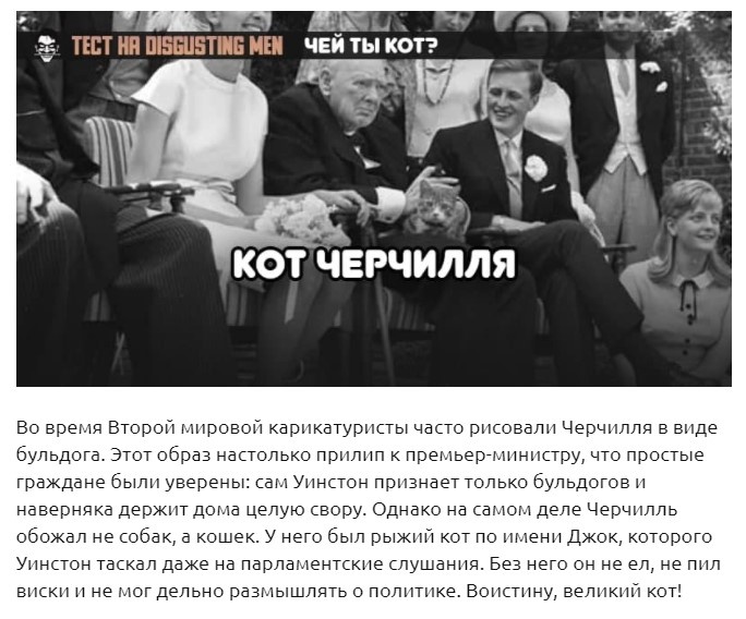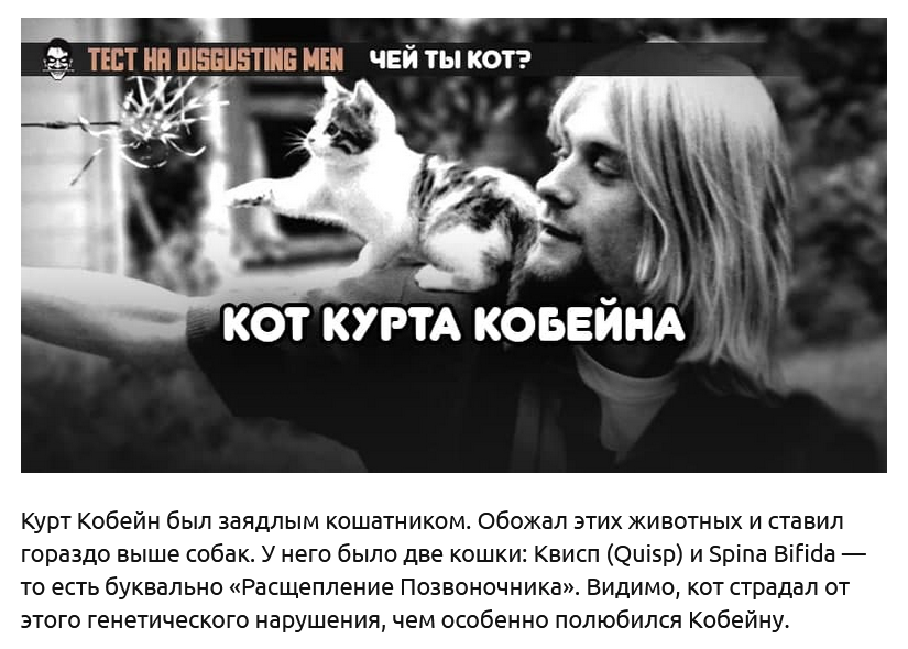 1 марта в России отмечают день кошек. Причина — фундаментальнейшая: в русском языке слова «кот» и «мартовский» всегда идут об руку. Где-то эти пушистые засранцы уже орут вовсю, не давая спать, где-то — едва показывают морды из-под снега. Но они чувствуют. Чувствуют приближение весны гораздо лучше нас. И лучший способ проникнуться духом этого дня — пройти наш очередной традиционно-бестолковый тест. Заодно можете узнать много нового — о себе, известных людях и кошках.