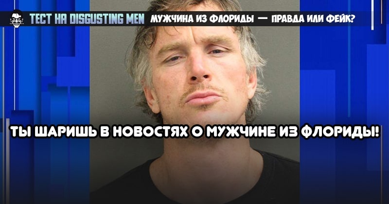 Мужчина из Флориды — как угарный дальний родственник, о котором ходят семейные легенды. Он давно покорил наши сердца, хотя и порядком поднадоел. Да и вообще, без него в «Понедельничной дичи» довольно быстро становится скучно. В общем, рано или поздно это должно было случиться: у нас набралась критическая масса материалов о мужчине из Флориды, и мы сбацали тест. Ave Florida Man!