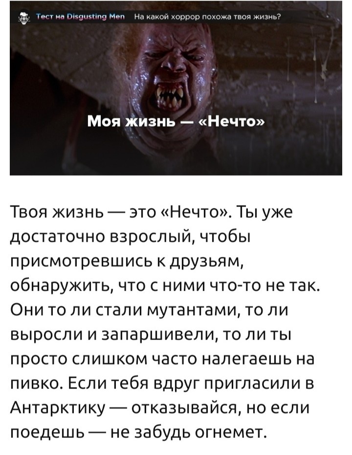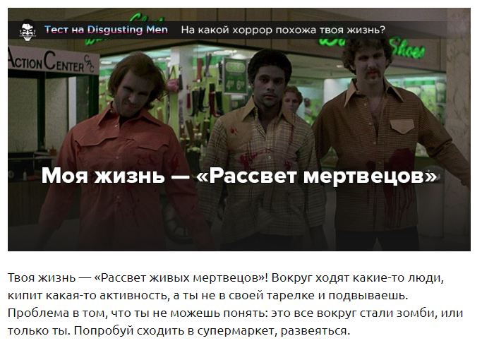 Возможно, ты даже не догадывался о том, что твое существование напоминает фильм ужасов. Со всей ответственностью заявляем: ты был не прав! Ответь на несколько вопросов о своем обыденном рутинном дне, и мы расскажем, на какой хоррор на самом деле похожа твоя жизнь.