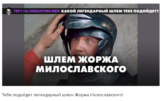 Обычно тест на Disgusting Men появляется так: мы на созвоне устраиваем мозговой штурм, в процессе которого выбираем самый бессмысленный и беспощадный вариант. Осознанно даунгрейдим идеи, двигаемся в сторону деэволюции, угораем по бестолковщине. Сами понимаете, без подобной отдушины в этой жизни нельзя. Так появился и этот тест, кристально чистый и кофейно-быстрый. 8 вопросов, 12 результатов на любой вкус. В основу лег наш старый материал о легендарных шлемах в поп-культуре.