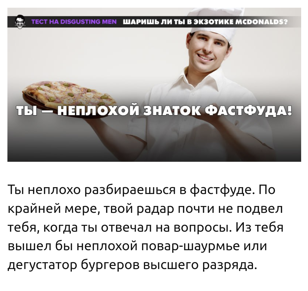Дааа. Я ничего не смыслю. 2 правильных на шару. В моем городе штуки 4-5 макдаков, но я все же предпочитаю травиться вкусной домашней пищей. В маке никогда не был. Но за тест спасибо. Узнал много прикольной шизнутой инфы