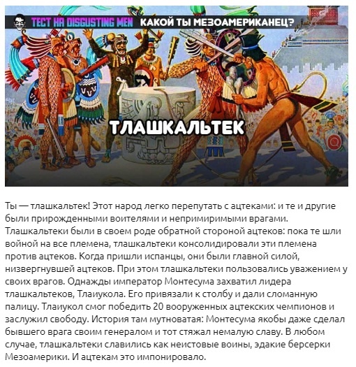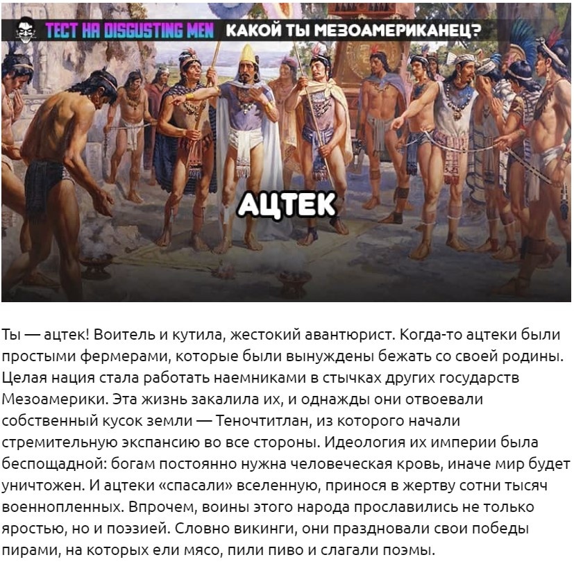 502 года назад, 12 марта 1519 года, Эрнан Кортес и его ватага конкистадоров высадились на побережье Центральной Америки. Так началось стремительное завоевание земель майя и ацтеков, а чуть позже их судьбу разделили инки. В честь этого катастрофического и эпохального события мы подготовили тест, который поможет узнать, кто из мезоамериканцев вам ближе. Кто знает, возможно, после него вы со страшной силой угорите по их истории?