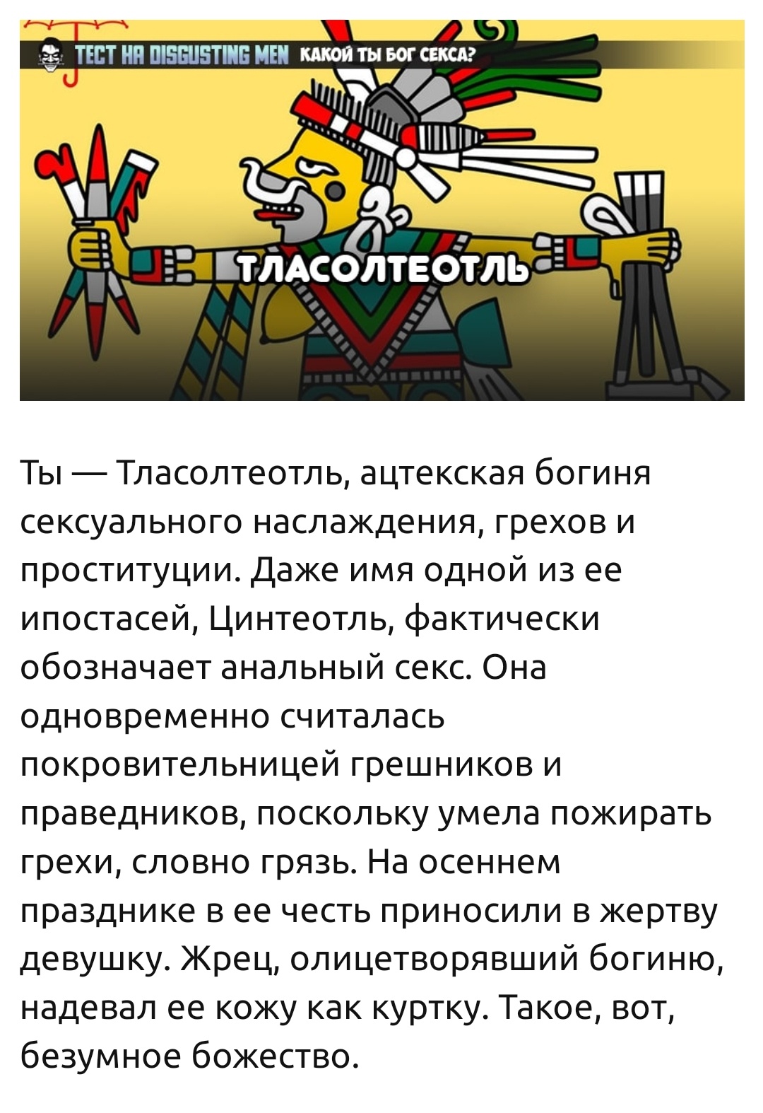Мы очень любим мифологию. Например, недавно мы делали тест «Какой ты бог бухла», а сейчас хотим угореть по мифологическому сексу. Тем более, у древних представления о нем были довольно интересными. Почти всегда боги плотской любви также являются богами войны. А у китайцев богиня секса — вообще профессиональная покровительница ниндзя (ну или как там это называлось у китайцев). Секс в стародавние времена виделся магической битвой, сражением, страстным поединком. В общем, погрузиться во все это чертовски интересно.