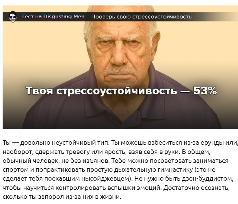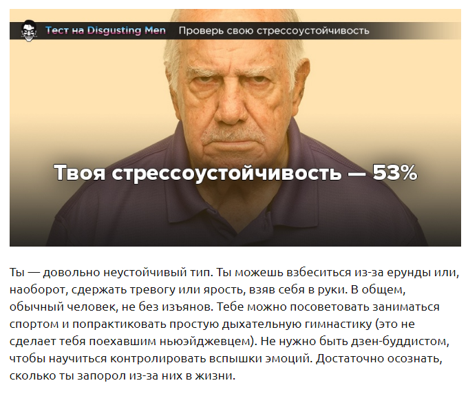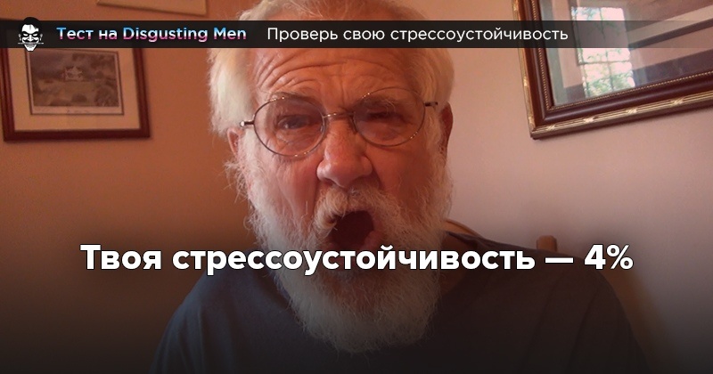 В первую среду ноября мир отмечает День борьбы со стрессом. Прекрасный повод отвлечься от работы и раздражения и развлечься, пройдя тест на Disgusting Men. Естественно, на глубокий психологизм и даже серьезность мы не претендуем. Но тест вполне может заставить задуматься о месте гнева и стресса в вашей жизни.