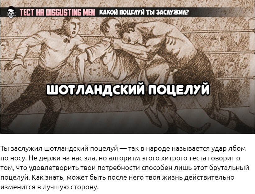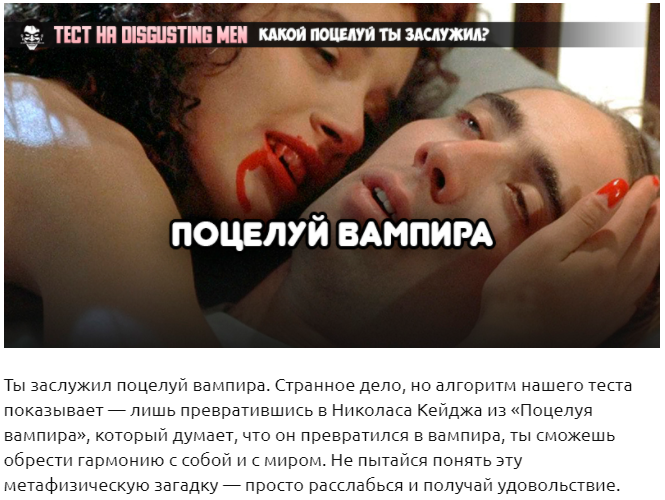 Ты заслужил поцелуй смерти, он же поцелуй мафии. Ходят легенды, что мафиози таким образом отмечали обреченного на смерть человека, провинившегося перед организацией. Однако в твоем случае все куда проще — ничем иным кроме поцелуя смерти угомонить твой разрушительный фонтан жизни просто невозможно. Так что подставляй губешки — для твоего и общего блага.