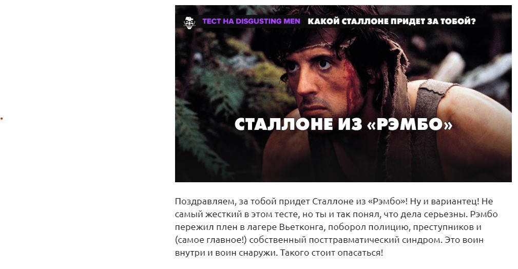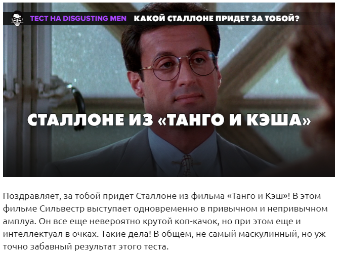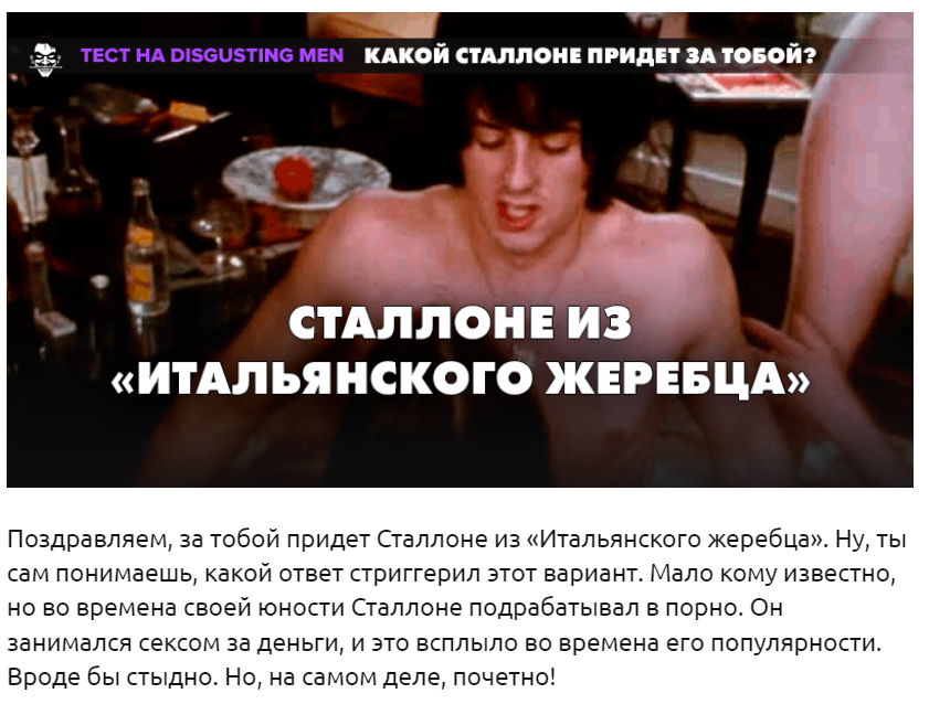 6 июля исполнилось 78 лет великому Сильвестру Сталлоне. Нашему Рокки, нашему Рэмбо, нашему Разрушителю! В эту честь мы решили сделать тест о том, какой из Сталлоне заберет твою душу за твои грехи. Посмотрев все его топовые фильмы, мы сделали очередной бессмысленный и беспощадный тест.