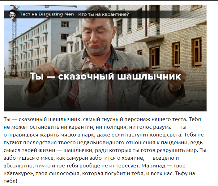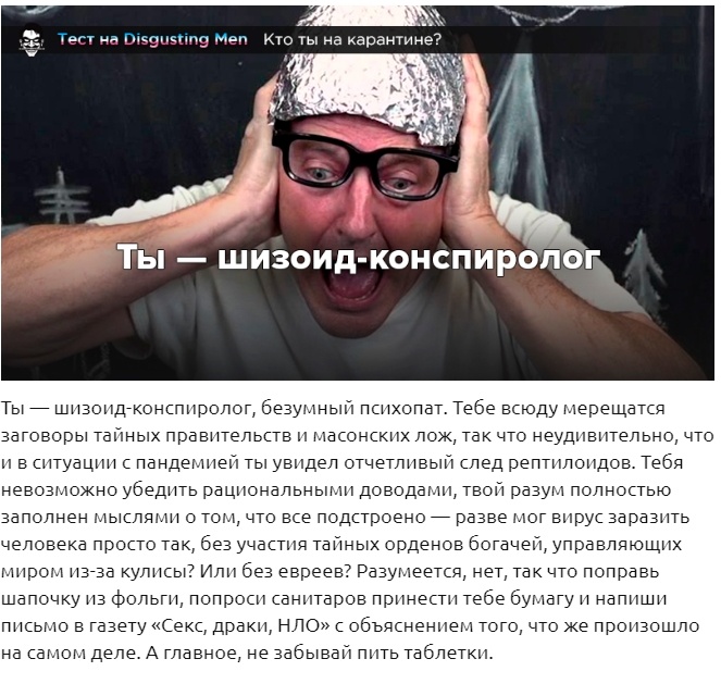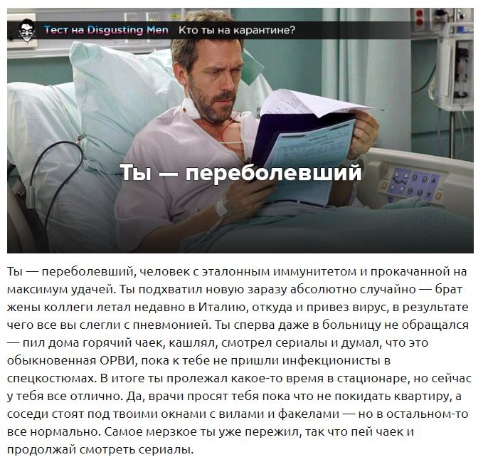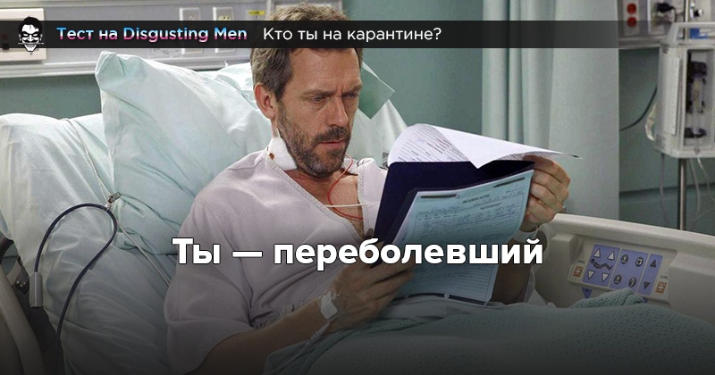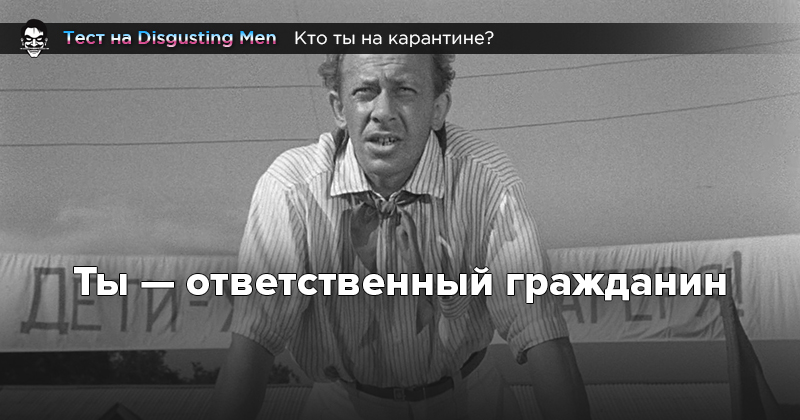 В самоизоляции сидеть еще месяц, а это значит, что пришло время для самого важного теста на Disgusting Men. Ответь на 10 простых вопросов и узнай, готов ли ты к карантину.