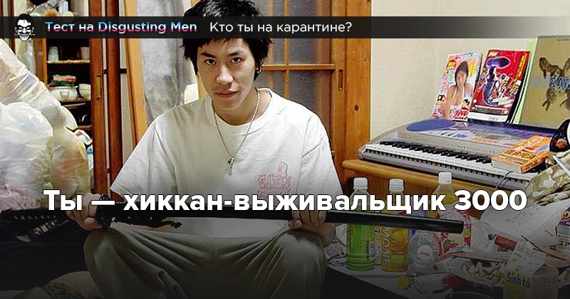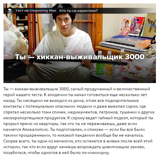 Ты — хиккан-выживальщик 3000, самый продуманный и величественный герой нашего теста. К эпидемии ты начал готовиться еще несколько лет назад. Ты месяцами не выходил из дома, отсек все подозрительные контакты с потенциально опасными людьми и даже выкопал схрон, где спрятал несколько тонн спичек, медикаментов, патронов, тушенки и других нескоропортящихся продуктов. К схрону ведет тайный подкоп, который ты прорыл прямо из квартиры, так что ты не переживаешь, даже если начнется Апокалипсис. Ты подготовлен, и спокоен — если бы все были такими прошаренными, то никакой пандемии вообще бы не началось. Скорее всего, ты один из немногих, кто останется в живых после всей этой истории, так что если вдруг начнешь возрождать цивилизацию заново, позаботься, чтобы идиотов в ней было по-минимуму.