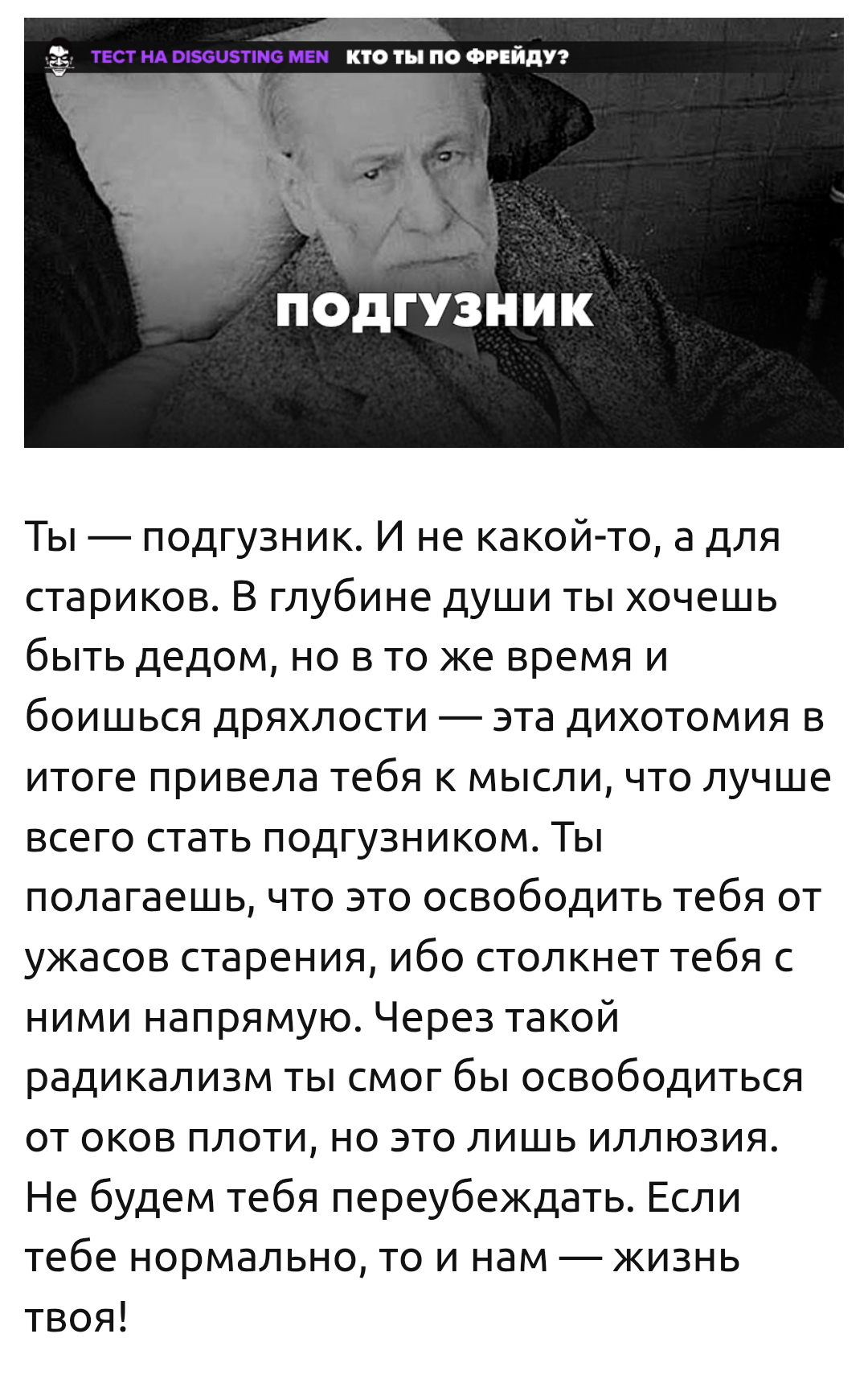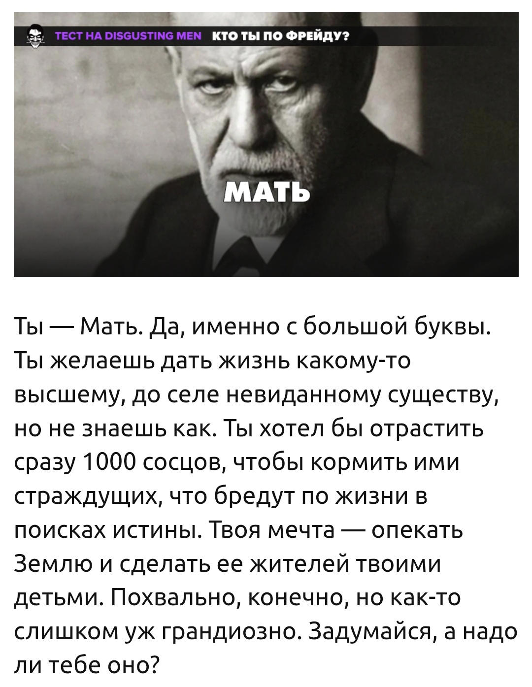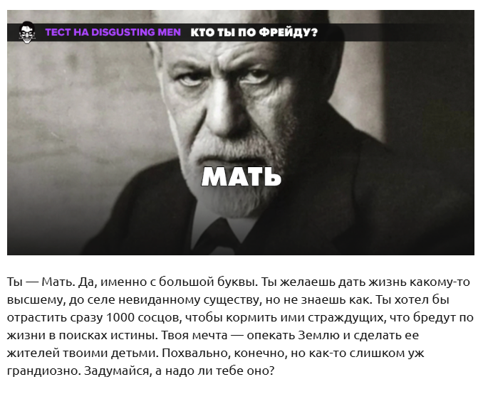По случаю праздника сделали невероятной точности и глубины тест, который позволит выявить вашу сокрытую сущность — все по заветам дедушки Фрейда. Отвечайте предельно честно, но с осторожностью, а то мало ли что.