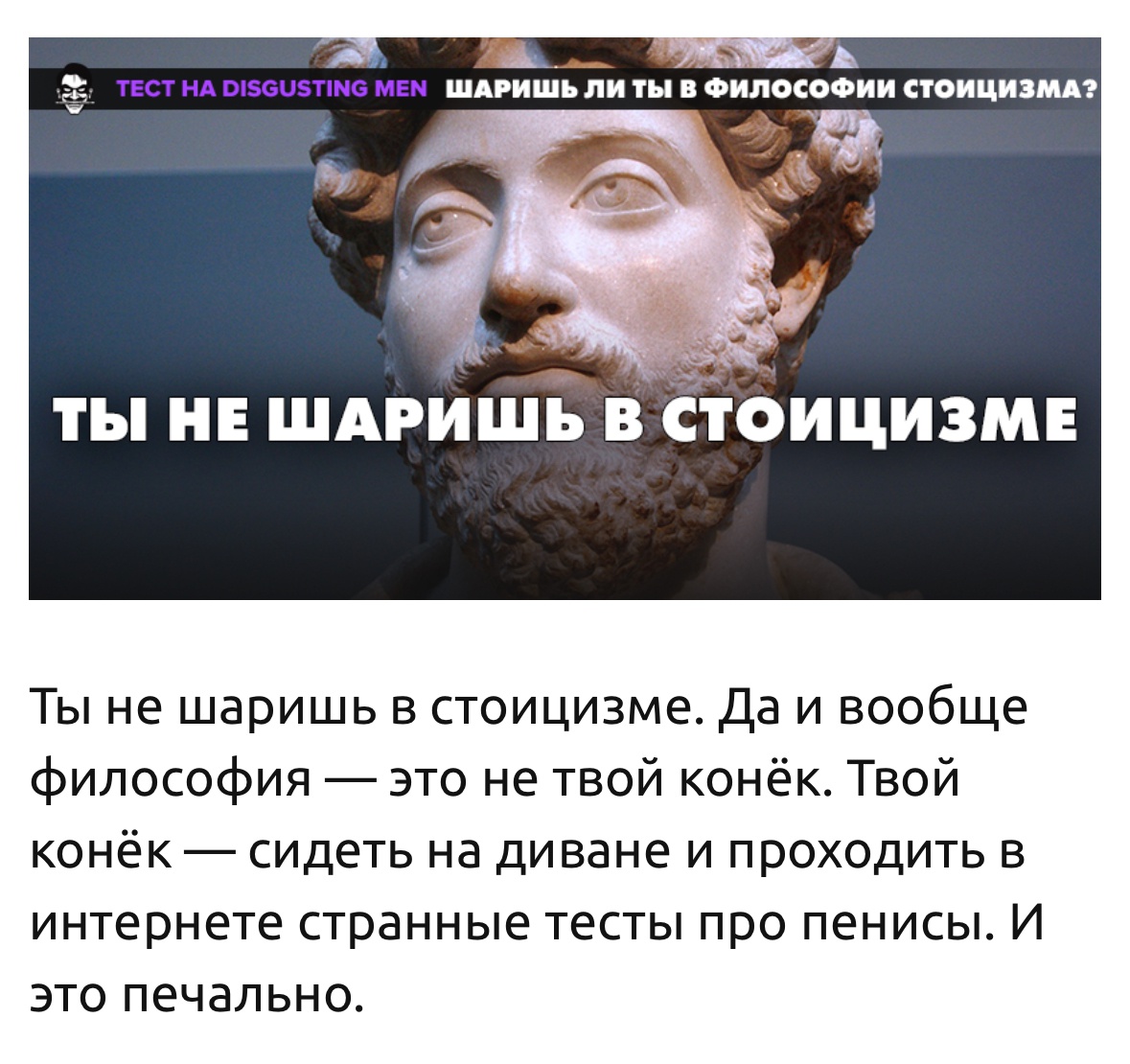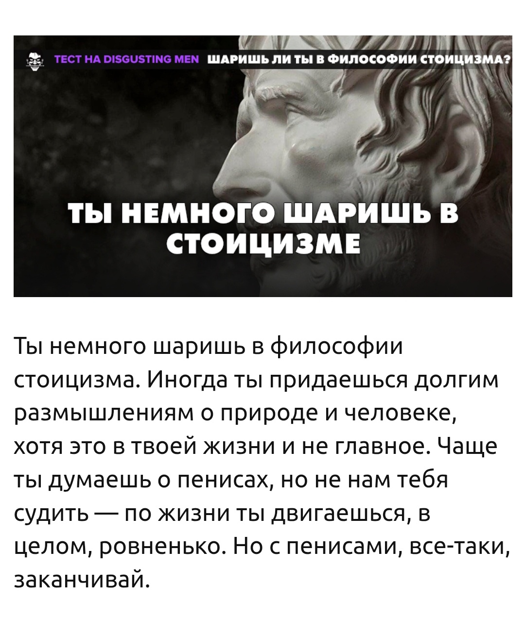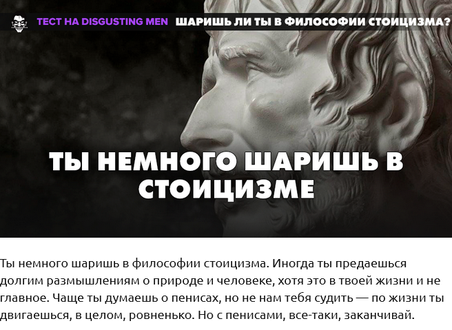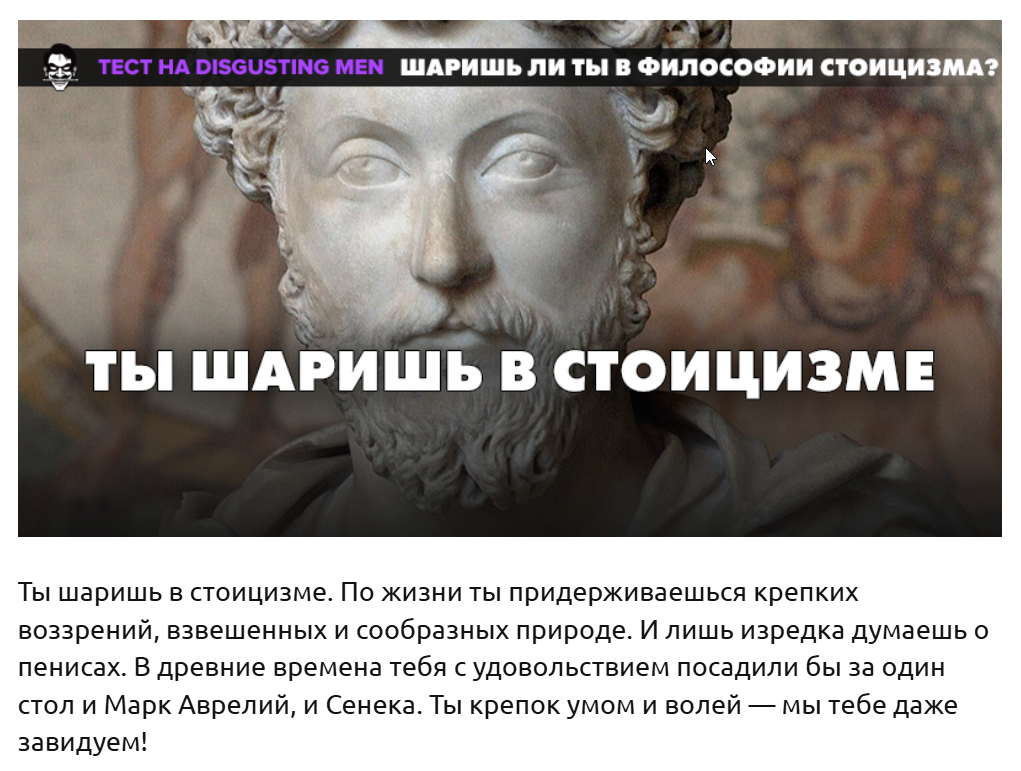 С помощью знающих людей мы сочинили коварный и каверзный тест, где поменяли некоторые слова из крылатых выражений известных стоиков на слово пенис. Отгадай, что же скрыто за пенисом, и проверь себя — а шаришь ли ты в стоицизме?