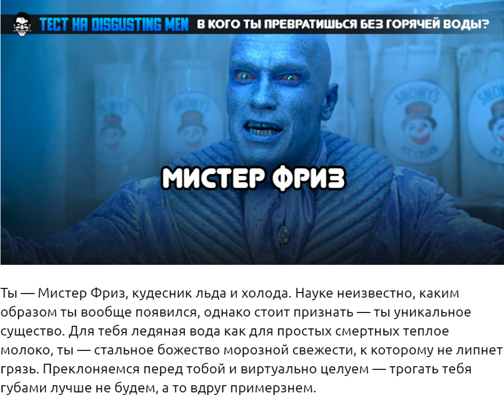 Ты — Мистер Фриз, кудесник льда и холода. Науке неизвестно, каким образом ты вообще появился, однако стоит признать — ты уникальное существо. Для тебя ледяная вода как для простых смертных теплое молоко, ты — стальное божество морозной свежести, к которому не липнет грязь. Преклоняемся перед тобой и виртуально целуем — трогать тебя губами лучше не будем, а то вдруг примерзнем.